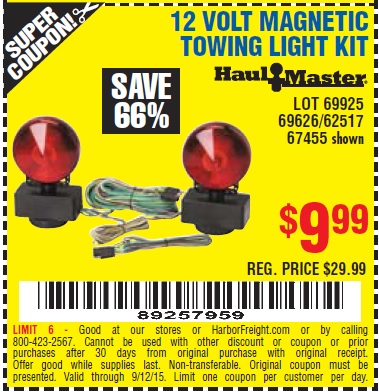 12 VOLT MAGNETIC TOWING LIGHT KIT Lot No. 62517/62753/67455/69626/69925/63100 Expired: 9/26/15 - $9.99 Coupon Code: '21152687'