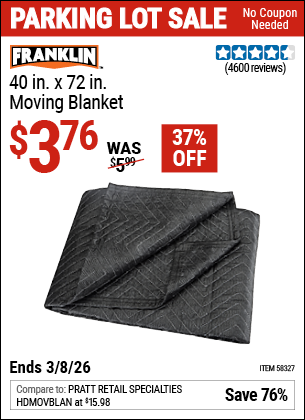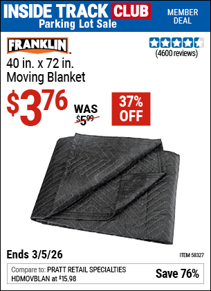 FRANKLIN 40 IN. X 72 IN. MOVING BLANKET Lot No. 58327 Expired: 9/14/25 - $4.99 Coupon Code: '11415240'