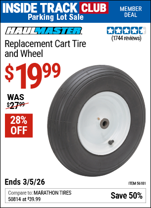 ITC HAUL-MASTER REPLACEMENT CART TIRE AND WHEEL Lot No. 56181 Valid Thru: 3/5/26 - $19.99 Coupon Code: 'n/a' (current price - 20% = 0) add to list