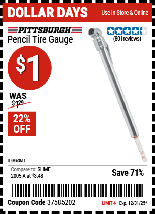 PITTSBURGH PENCIL TIRE GAUGE Lot No. 63611 Expired: 4/10/25 - $0.99 Coupon Code: 'n/a'