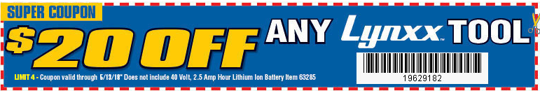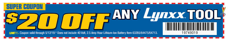 $20 OFF ANY LYNXX TOOL Lot No. 63286/63289/63284/63287/63288 Expired: 5/12/19 - $20 Coupon Code: '19749019'