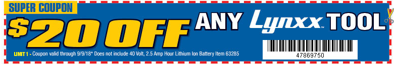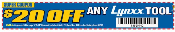 $20 OFF ANY LYNXX TOOL Lot No. 63286/63289/63284/63287/63288 Expired: 7/31/18 - $0 Coupon Code: '21127604'