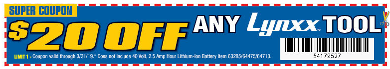 $20 OFF ANY LYNXX TOOL Lot No. 63286/63289/63284/63287/63288 Expired: 3/31/19 - $20 Coupon Code: '54179527'