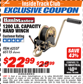 ITC 1200 LB. CAPACITY HAND WINCH Lot No. 62537/65115 Expired: 6/30/15 - $22.99 Coupon Code: '89679762'