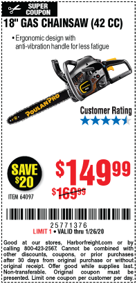 18" GAS CHAINSAW (42CC) Lot No. 64097 Expired: 1/26/20 - $149.99 Coupon Code: '25771376'