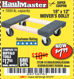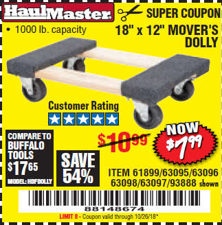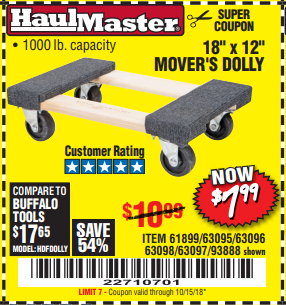 18" X 12" HARDWOOD MOVER'S DOLLY Lot No. 93888/60497/61899/62399/63095/63096/63097/63098 Expired: 10/1/18 - $7.99 Coupon Code: '20152544'