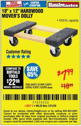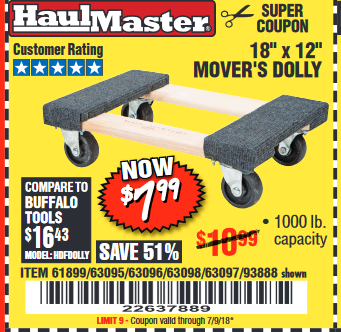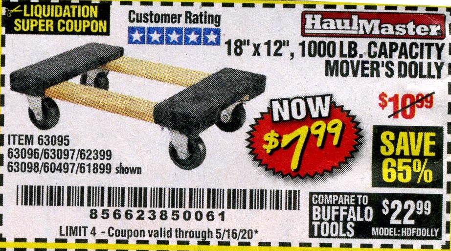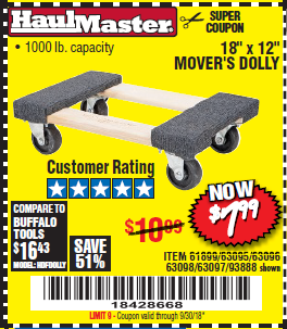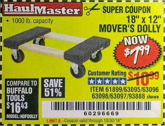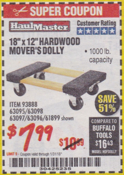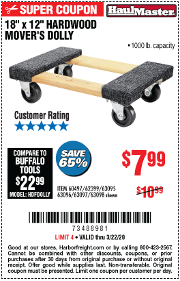 18" X 12" HARDWOOD MOVER'S DOLLY Lot No. 93888/60497/61899/62399/63095/63096/63097/63098 Expired: 8/31/17 - $7.99 Coupon Code: '29099293'