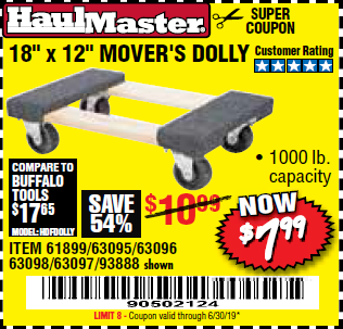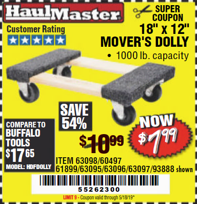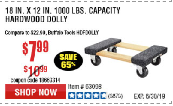 18" X 12" HARDWOOD MOVER'S DOLLY Lot No. 93888/60497/61899/62399/63095/63096/63097/63098 Expired: 5/31/19 - $7.99 Coupon Code: '40270004'