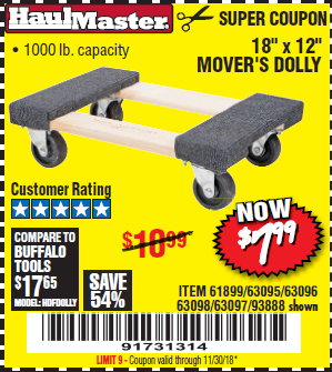 18" X 12" HARDWOOD MOVER'S DOLLY Lot No. 93888/60497/61899/62399/63095/63096/63097/63098 Expired: 11/30/17 - $7.99 Coupon Code: '12785507'