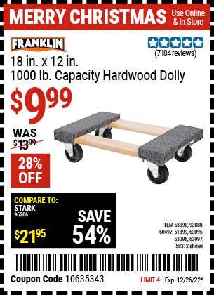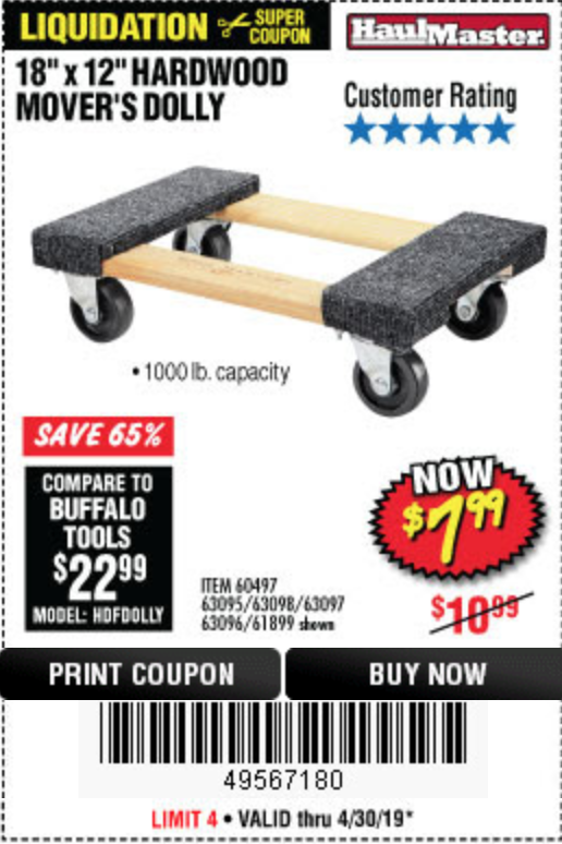 18" X 12" HARDWOOD MOVER'S DOLLY Lot No. 93888/60497/61899/62399/63095/63096/63097/63098 Expired: 4/6/19 - $7.99 Coupon Code: '19133809'