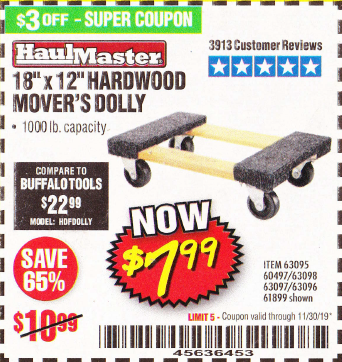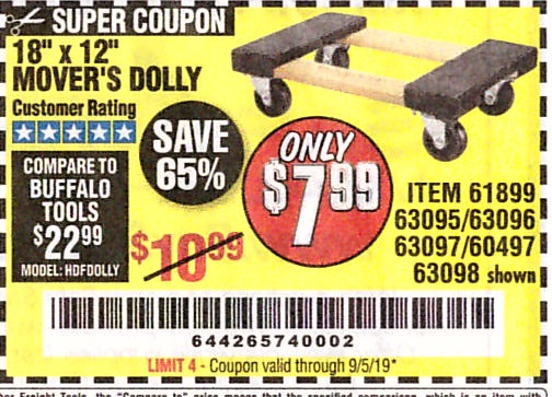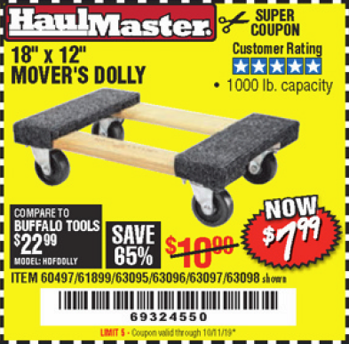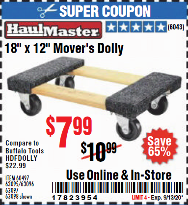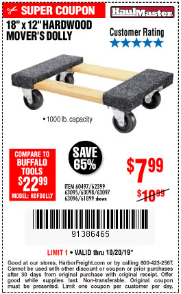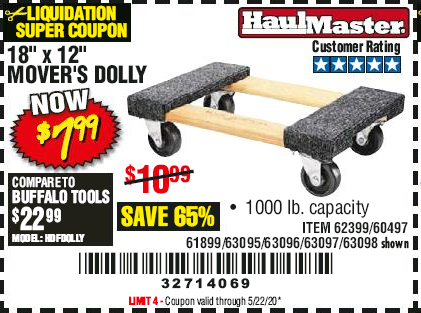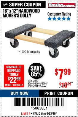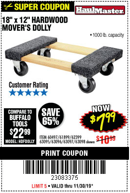 18" X 12" HARDWOOD MOVER'S DOLLY Lot No. 93888/60497/61899/62399/63095/63096/63097/63098 Expired: 9/30/19 - $7.99 Coupon Code: '62051149'