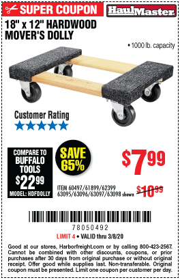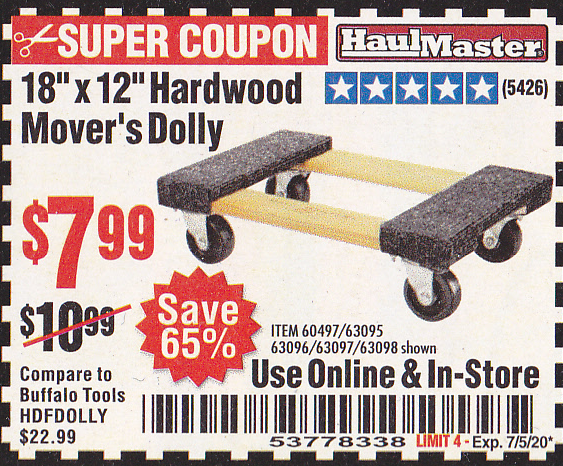 18" X 12" HARDWOOD MOVER'S DOLLY Lot No. 93888/60497/61899/62399/63095/63096/63097/63098 Expired: 3/31/19 - $7.99 Coupon Code: '24996775'