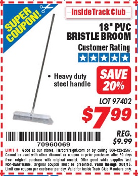 ITC 18 IN. PVC BRISTLE BROOM Lot No. 97402 Expired: 3/31/15 - $7.99 Coupon Code: '70960069'