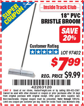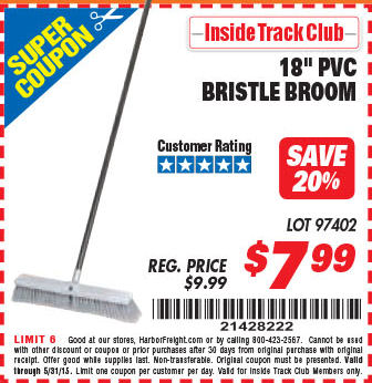 ITC 18 IN. PVC BRISTLE BROOM Lot No. 97402 Expired: 7/31/15 - $7.99 Coupon Code: '42263120'