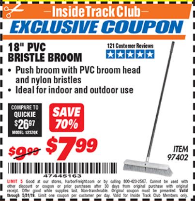ITC 18 IN. PVC BRISTLE BROOM Lot No. 97402 Expired: 5/31/19 - $7.99 Coupon Code: '47445163'