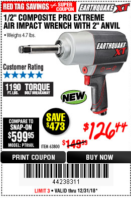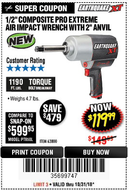 1/2" COMPOSITE PRO EXTREME AIR IMPACT WITH 2" ANVIL Lot No. 63800 Expired: 10/31/18 - $119.99 Coupon Code: '35699747'