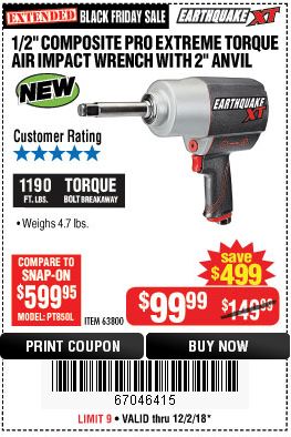 1/2" COMPOSITE PRO EXTREME AIR IMPACT WITH 2" ANVIL Lot No. 63800 Expired: 12/2/18 - $99.99 Coupon Code: '67046415'
