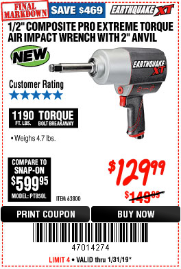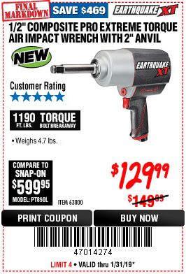 1/2" COMPOSITE PRO EXTREME AIR IMPACT WITH 2" ANVIL Lot No. 63800 Expired: 1/31/19 - $129.99 Coupon Code: '47014274'