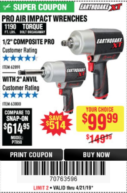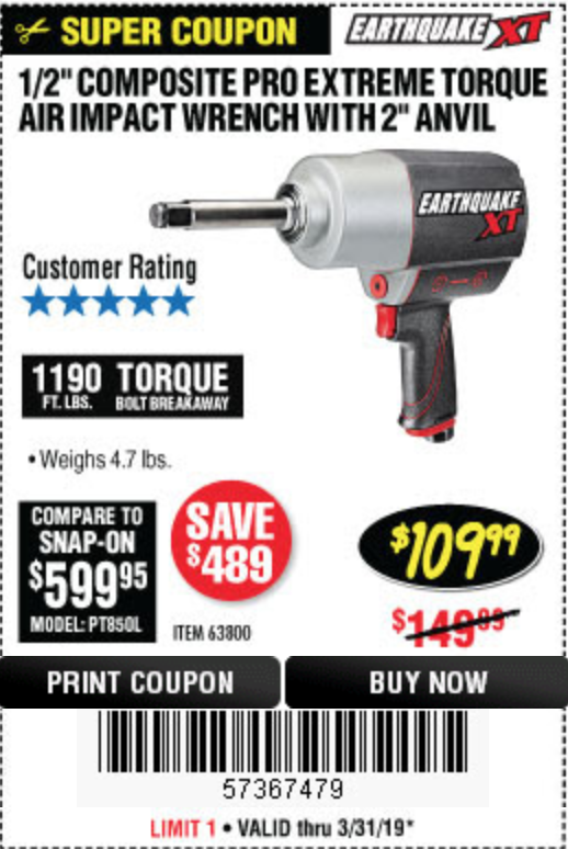 1/2" COMPOSITE PRO EXTREME AIR IMPACT WITH 2" ANVIL Lot No. 63800 Expired: 3/31/19 - $109.99 Coupon Code: '12238255'