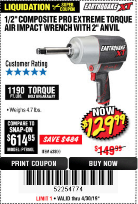 1/2" COMPOSITE PRO EXTREME AIR IMPACT WITH 2" ANVIL Lot No. 63800 Expired: 4/30/19 - $129.99 Coupon Code: '52254774'