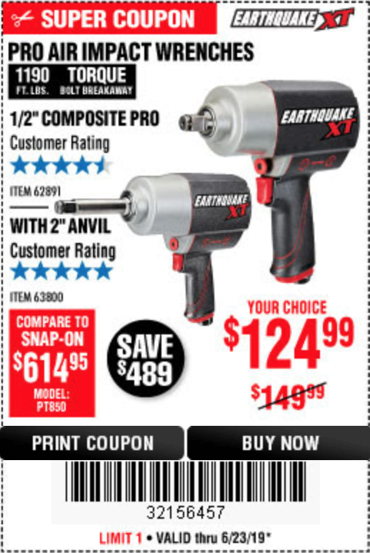 1/2" COMPOSITE PRO EXTREME AIR IMPACT WITH 2" ANVIL Lot No. 63800 Expired: 6/23/19 - $124.99 Coupon Code: '4912774'