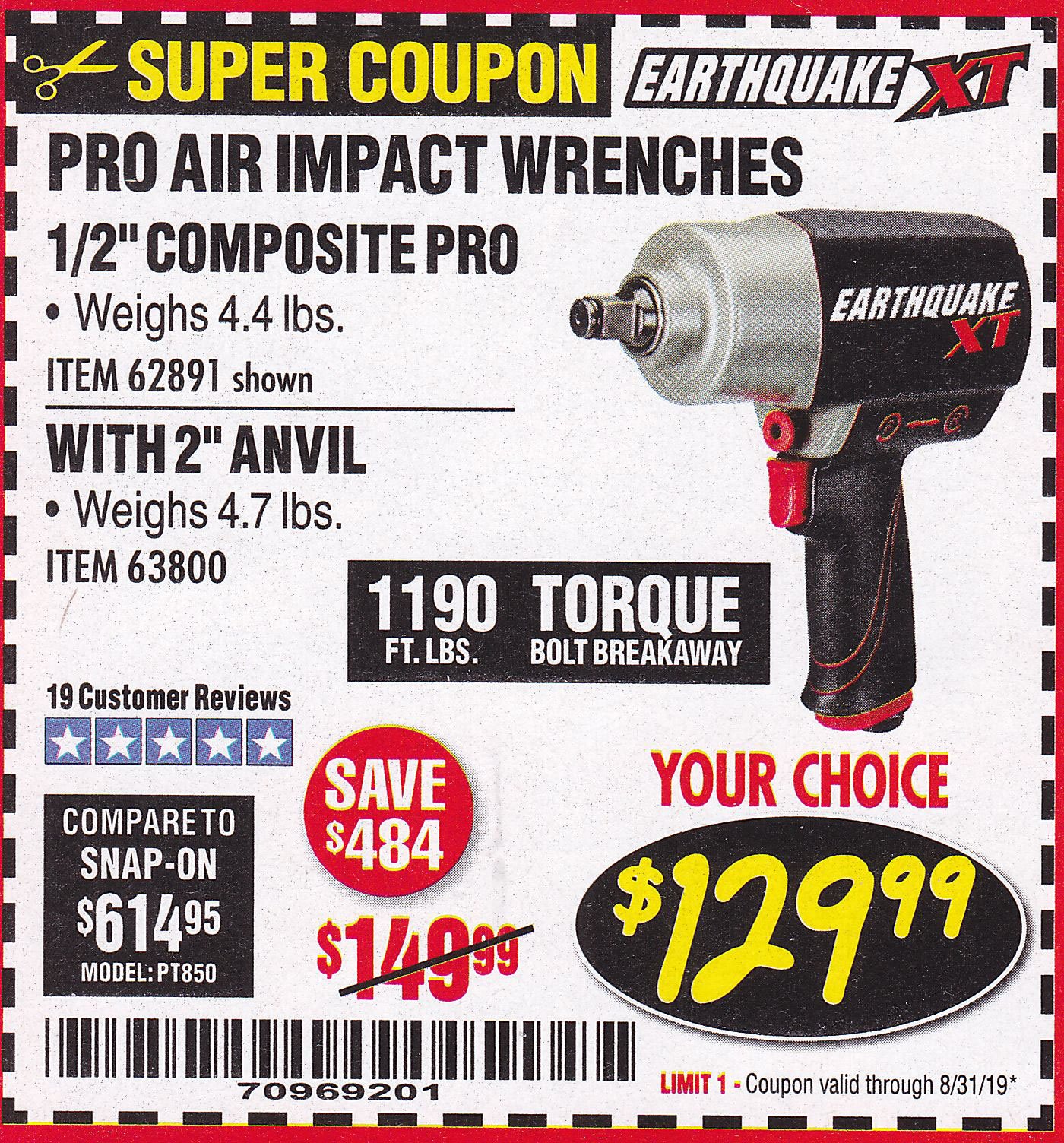 1/2" COMPOSITE PRO EXTREME AIR IMPACT WITH 2" ANVIL Lot No. 63800 Expired: 8/31/19 - $129.99 Coupon Code: '70969201'