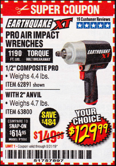 1/2" COMPOSITE PRO EXTREME AIR IMPACT WITH 2" ANVIL Lot No. 63800 Expired: 8/18/19 - $129.99 Coupon Code: '51666375'