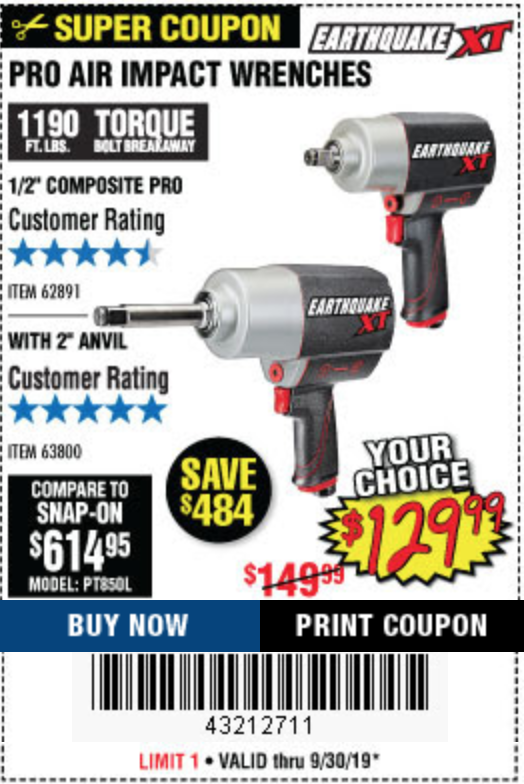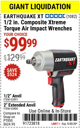 1/2" COMPOSITE PRO EXTREME AIR IMPACT WITH 2" ANVIL Lot No. 63800 Expired: 9/30/19 - $129.99 Coupon Code: '43212711'
