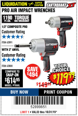 1/2" COMPOSITE PRO EXTREME AIR IMPACT WITH 2" ANVIL Lot No. 63800 Expired: 10/31/19 - $119.99 Coupon Code: '52899651'