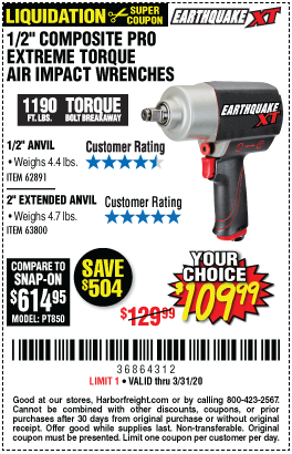 1/2" COMPOSITE PRO EXTREME AIR IMPACT WITH 2" ANVIL Lot No. 63800 Expired: 3/31/20 - $109.99 Coupon Code: '36864312'