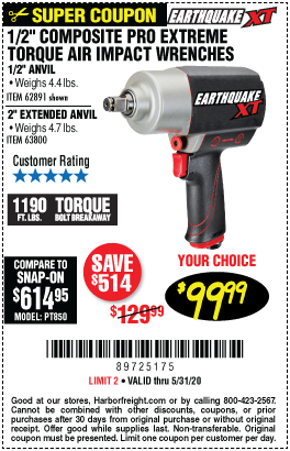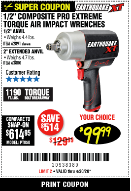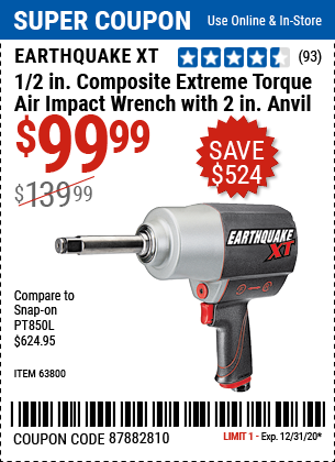 1/2" COMPOSITE PRO EXTREME AIR IMPACT WITH 2" ANVIL Lot No. 63800 Expired: 12/31/20 - $99.99 Coupon Code: '87882810'
