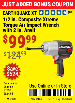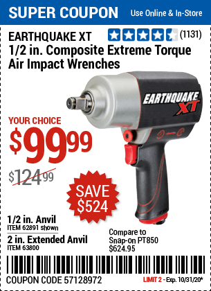 1/2" COMPOSITE PRO EXTREME AIR IMPACT WITH 2" ANVIL Lot No. 63800 Expired: 10/31/20 - $99.99 Coupon Code: '57071349'