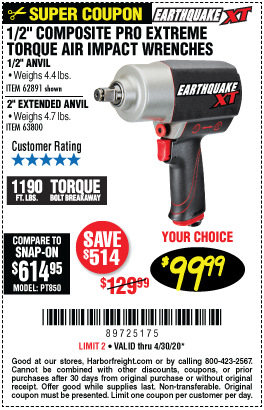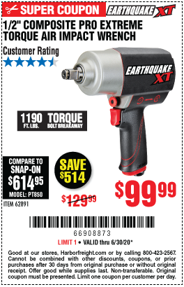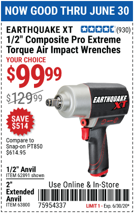 1/2" COMPOSITE PRO EXTREME TORQUE IMPACT WRENCHES Lot No. 62891/63800 Expired: 6/30/20 - $99.99 Coupon Code: '66908873'