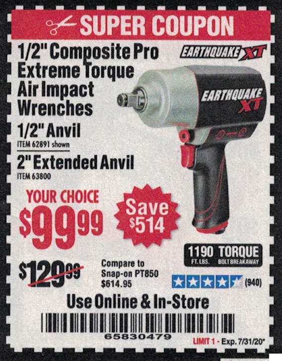 1/2" COMPOSITE PRO EXTREME TORQUE IMPACT WRENCHES Lot No. 62891/63800 Expired: 7/31/20 - $99.99 Coupon Code: '65830479'