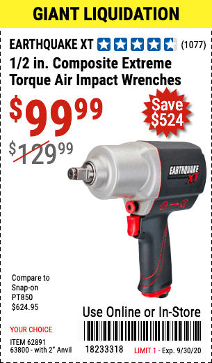 1/2" COMPOSITE PRO EXTREME TORQUE IMPACT WRENCHES Lot No. 62891/63800 Expired: 9/30/20 - $99.99 Coupon Code: '18233318'