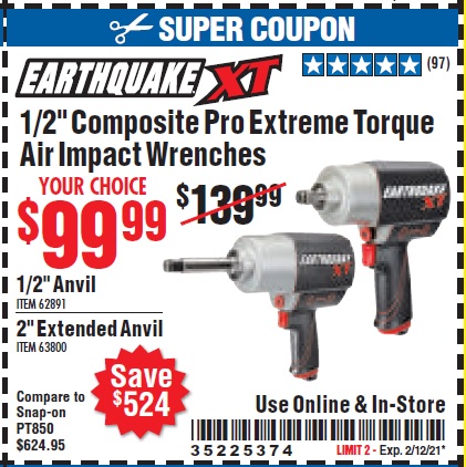 1/2" COMPOSITE PRO EXTREME TORQUE IMPACT WRENCHES Lot No. 62891/63800 Expired: 2/12/21 - $99.99 Coupon Code: '35225374'