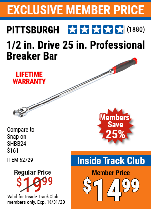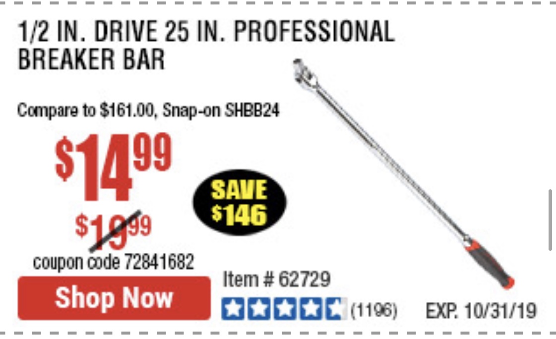 1/2" DRIVE 25" PROFESSIONAL BREAKER BAR Lot No. 62729 Expired: 10/31/19 - $14.99 Coupon Code: '72841682'