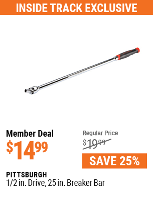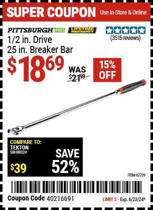 1/2" DRIVE 25" PROFESSIONAL BREAKER BAR Lot No. 62729 Expired: 6/18/23 - $16.99 Coupon Code: '69551011'
