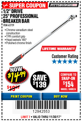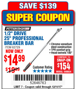 1/2" DRIVE 25" PROFESSIONAL BREAKER BAR Lot No. 62729 Expired: 11/30/17 - $14.99 Coupon Code: '12942553'