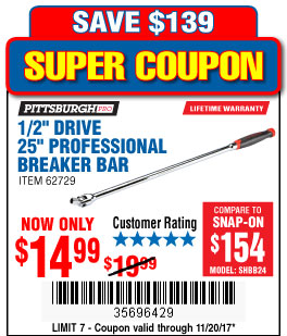 1/2" DRIVE 25" PROFESSIONAL BREAKER BAR Lot No. 62729 Expired: 11/20/17 - $14.99 Coupon Code: '35696429'
