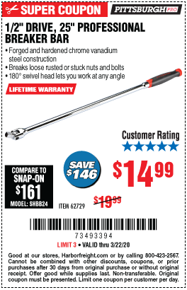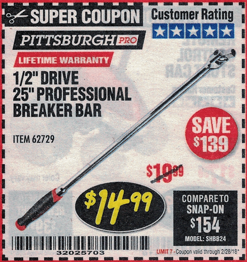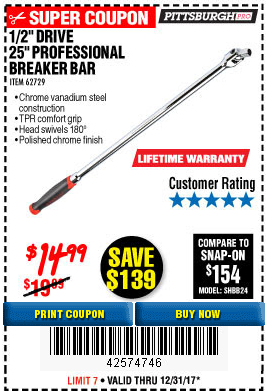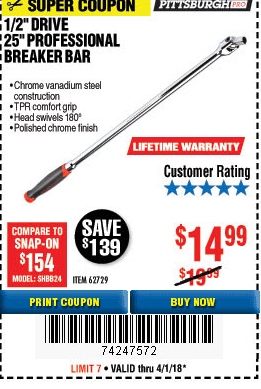 1/2" DRIVE 25" PROFESSIONAL BREAKER BAR Lot No. 62729 Expired: 2/28/18 - $14.99 Coupon Code: '32025703'
