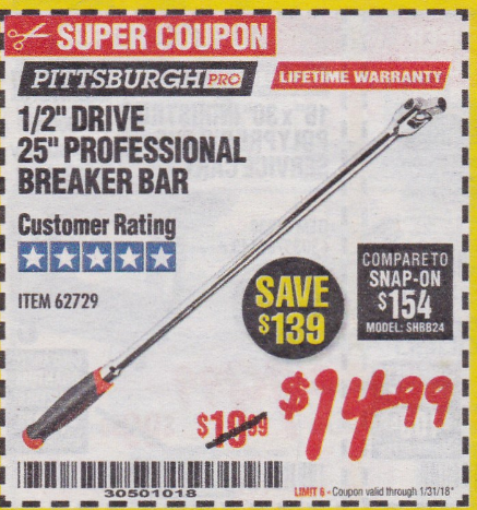 1/2" DRIVE 25" PROFESSIONAL BREAKER BAR Lot No. 62729 Expired: 1/31/18 - $14.99 Coupon Code: '30501018'