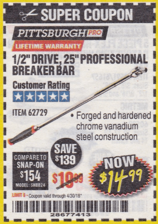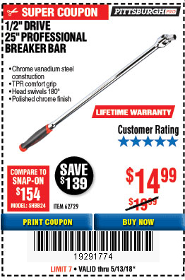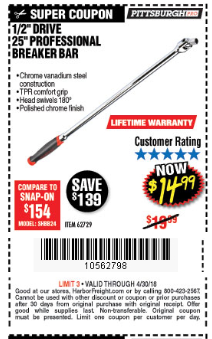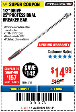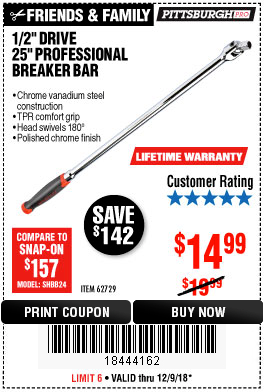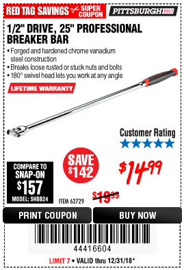 1/2" DRIVE 25" PROFESSIONAL BREAKER BAR Lot No. 62729 Expired: 4/30/18 - $14.99 Coupon Code: '10562798'