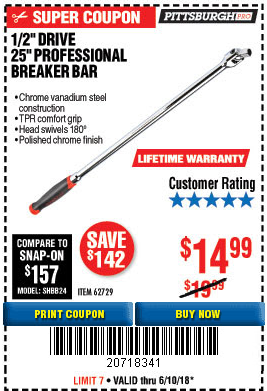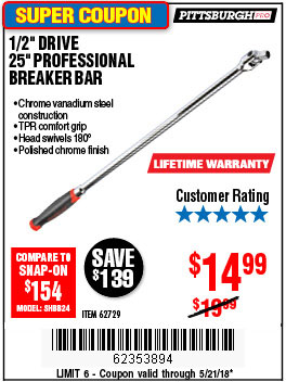 1/2" DRIVE 25" PROFESSIONAL BREAKER BAR Lot No. 62729 Expired: 5/21/18 - $14.99 Coupon Code: '62353894'