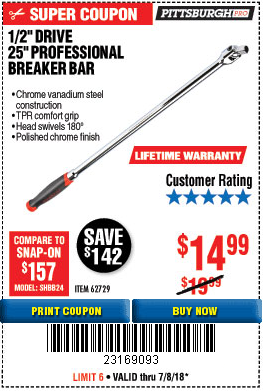1/2" DRIVE 25" PROFESSIONAL BREAKER BAR Lot No. 62729 Expired: 7/8/18 - $14.99 Coupon Code: '23169093'