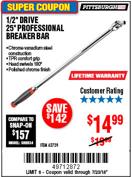 1/2" DRIVE 25" PROFESSIONAL BREAKER BAR Lot No. 62729 Expired: 7/23/18 - $14.99 Coupon Code: '49712872'