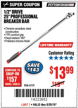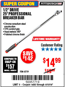 1/2" DRIVE 25" PROFESSIONAL BREAKER BAR Lot No. 62729 Expired: 8/13/18 - $14.99 Coupon Code: '56957719'
