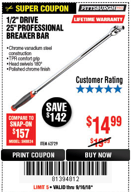 1/2" DRIVE 25" PROFESSIONAL BREAKER BAR Lot No. 62729 Expired: 9/16/18 - $14.99 Coupon Code: '81394812'