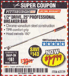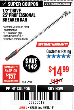 1/2" DRIVE 25" PROFESSIONAL BREAKER BAR Lot No. 62729 Expired: 9/30/18 - $14.99 Coupon Code: '28207488'