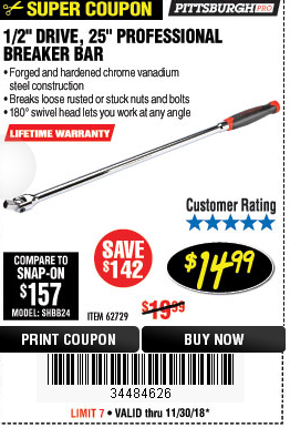 1/2" DRIVE 25" PROFESSIONAL BREAKER BAR Lot No. 62729 Expired: 11/30/18 - $14.99 Coupon Code: '34484626'